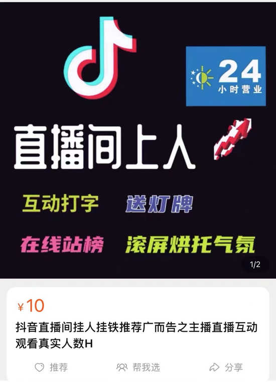 在某平台上,不乏大量“直播水军”的服务,产业链一应俱全。所谓的“直播机器粉”可以滚屏充当气氛组,还可以暗箱操作注水GMV。