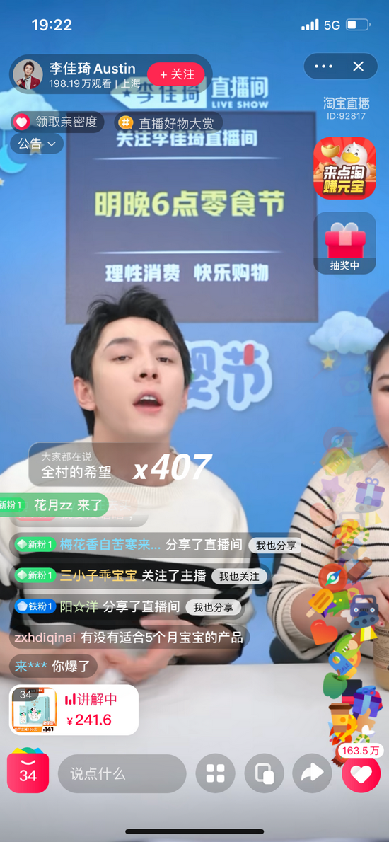 “哈喽,大家好,我们来喽,我们来喽!”20日晚上7点整,李佳琦“母婴节”直播准时开始,像往常一样,李佳琦侧向一方,与刚刚进入直播间的网友互动。