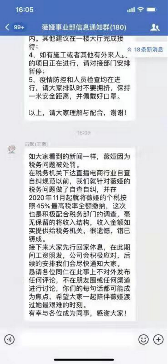 谦寻控股一楼大堂内部情况事发不久,一张“薇娅事业部信息通知群”的群聊截图在网络上流传,名为“古默(王斯)”的员工于16:05分发出消息:接下来大家先行回家休息,在此期间工资照发,公司会积极应对。据了解,薇娅经纪人就叫王斯,花名古默。