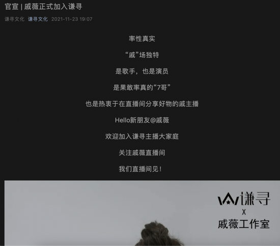 11月23日,事发前7天,戚薇正式官宣加入谦寻。