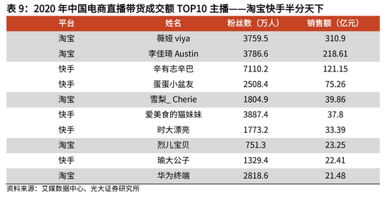 根据艾媒数据中心和光大证券研究所的数据显示,2020年中国电商直播带货成交额top10的主播中,淘宝快手半分天下,其中薇娅第一,李佳琦第二,之前已经因偷税漏税被处罚了的雪梨排在第五。