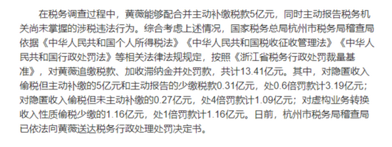 5分钟后,新华社发表了评论《查处黄薇偷逃税案件再次敲响警钟,直播行业规范发展仍需多部门协同发力》,并称已有上千主播主动自查补缴税款,同时税务部门也公开了《就薇娅偷逃税案件答记者问》,其中提到,黄薇首次被税务机关按偷税予以行政处罚且此前未因逃避缴纳税款受过刑事处罚,若其能在规定期限内缴清税款、滞纳金和罚款,则依法不予追究刑事责任。