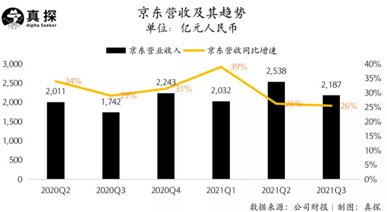 据上月发布的财报显示,京东三季度总营收为2187亿元,同比增长25.5%,超过市场预估的2156.1亿元。其中“平台及服务收入”(主要来自3P业务的广告和佣金收入)达168亿元,同比增长35%;“物流及其他服务收入”(主要来自物流外单)达159亿元,同比增长53%。