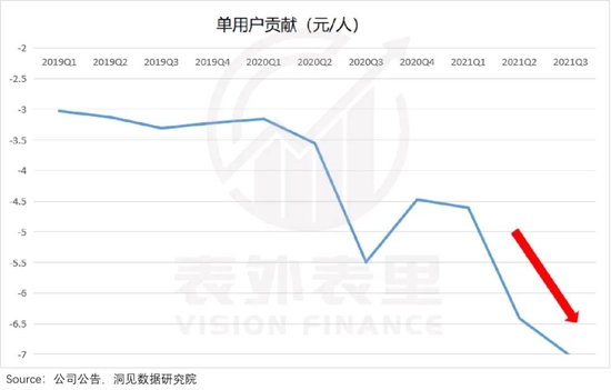 如下图,B站的单用户贡献从2020Q2开始,出现明显下滑趋势。