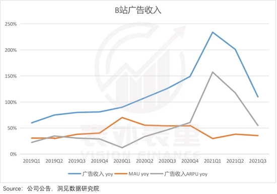 而抛开宏观环境影响,就广告收入(广告收入=MAU*ARPU)本身来说,从2020Q2开始,B站广告收入由MAU增速驱动转变为ARPU增速驱动。
