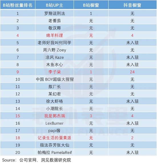 比如,B站粉丝量前20名的UP主,很少有在B站中开通橱窗的;但这些UP主在抖音中不仅开通了橱窗,且商品数量也很多。