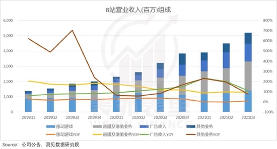 从展现B站富有程度的收入构成看,2021Q3,除了游戏增速小幅上升之外,广告、增值服务以及其他业务的增速,均出现下滑。