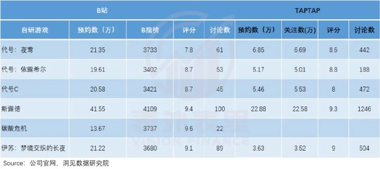 但一方面,面临腾讯、网易等大厂以及米哈游等中小厂商的夹击,另一方面,六款游戏本身在B站和TAPTAP上,预约数和关注度也不太高。