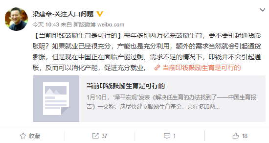 1月12日,梁建章公开表示:“当前印钱鼓励生育是可行的”,并且认为任泽平的观点还是有些保守,“每年两万亿不够至少需四五万亿”。