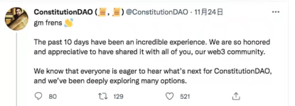 就连Constitution DAO的创始人也在推特上说,“我们众筹购买《美国宪法》的项目失败了,但我觉得这没关系,我们已经创造了历史,没有一家自治组织能够在短短一周时间里筹集到4700万美元,我们利用区块链技术第一次做到了自治组织大额融资,而所有的一切都只是来自于一个拍卖《美国宪法》的想法”。