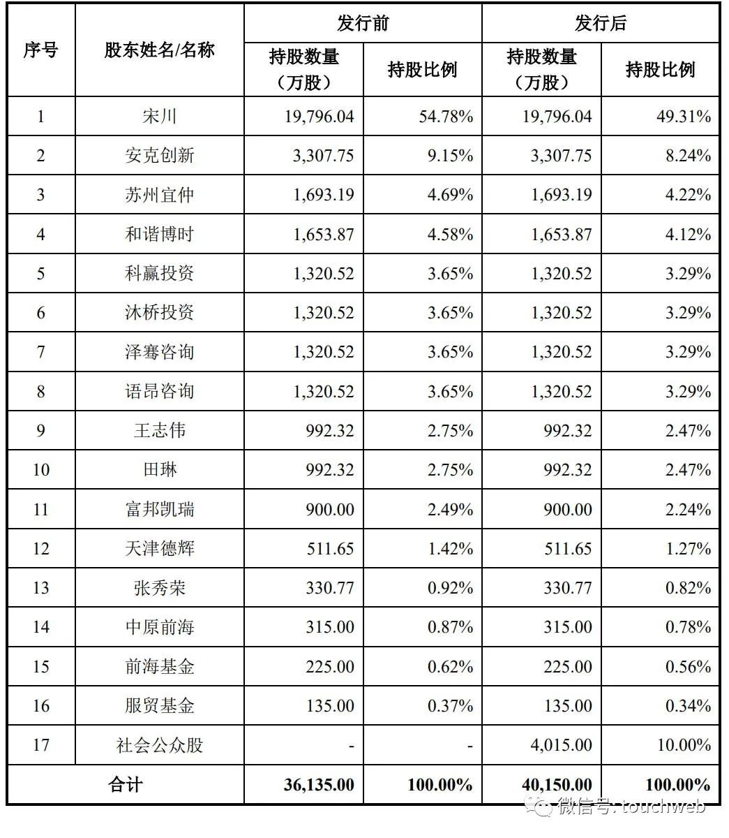 IPO后,宋川直接持股49.31%,安克创新持股8.24%,苏州宜仲持股4.22%,和谐博时持股4.12%,科赢投资、沐桥投资、泽骞咨询、语昂咨询分别持股3.29%,王志伟、田琳分别持股为2.47% ,富邦凯瑞持股为2.24%。