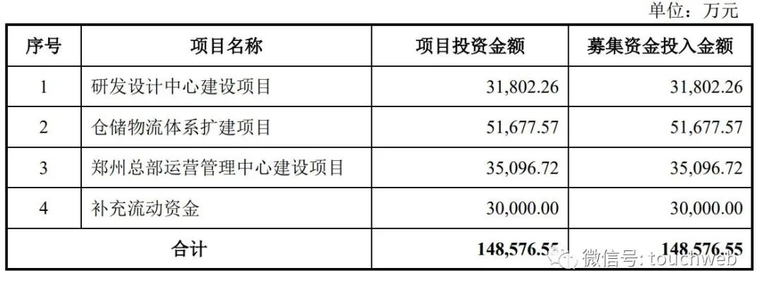 致欧家居曾计划募资14.86亿元,其中,3.18亿元用于研发设计中心建设项目,5.17亿元用于仓储物流体系扩建项目,3.5亿元用于郑州总部运营管理中心建设项目,3亿元用于补充流动资金。