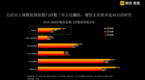 然而近年来,餐饮连锁扩张的步伐却在加快。数据显示,从2018年到2020年,万店以上规模的餐饮连锁门店数量在总数中的占比从0.7%增长到1.4%,仅三年时间占比翻倍。而中国的餐饮连锁化率,也在三年间从12.8%提升到15%。