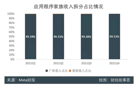 Meta的传统业务盈利方式有两种:一是广告收入,二是其他收入,其中广告收入是大头,贡献占比超过了99%。