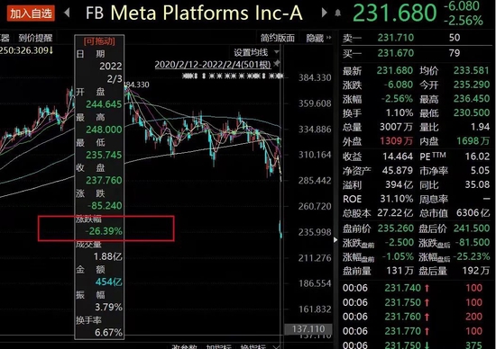 当日,Meta盘前跌幅超20%,盘后跌幅接近23%;市场对其表现出持续悲观,2月3日,Meta市值蒸发2400亿美元,暴跌超过20%,受此影响,扎克伯克的个人财富,一夜损失逼近300亿美元,已经跌出福布斯富豪榜单的前十。