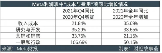导致Meta利润下降真正的问题出现在费用端,最引人注目的同样是“一般和行政费用”,纵向对比季度和年度差异,这项费用全年增长仅为50.15%,而2021年第四季度却高达106%。