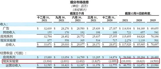 已经迈进新旧业务交接的临界点,应用程序家族虽然营收占主导,但Meta逐渐加强对营收占比小的现实实验室投入,包括硬件成本、核心基础架构投资和向合作伙伴的付款,巨资投入导致现实实验室业务入不敷出,越赚越亏:2021Q4亏损33.4亿美元;一年比一年亏得多,从2019年亏损45亿美元到2021年亏损超过100亿美元。