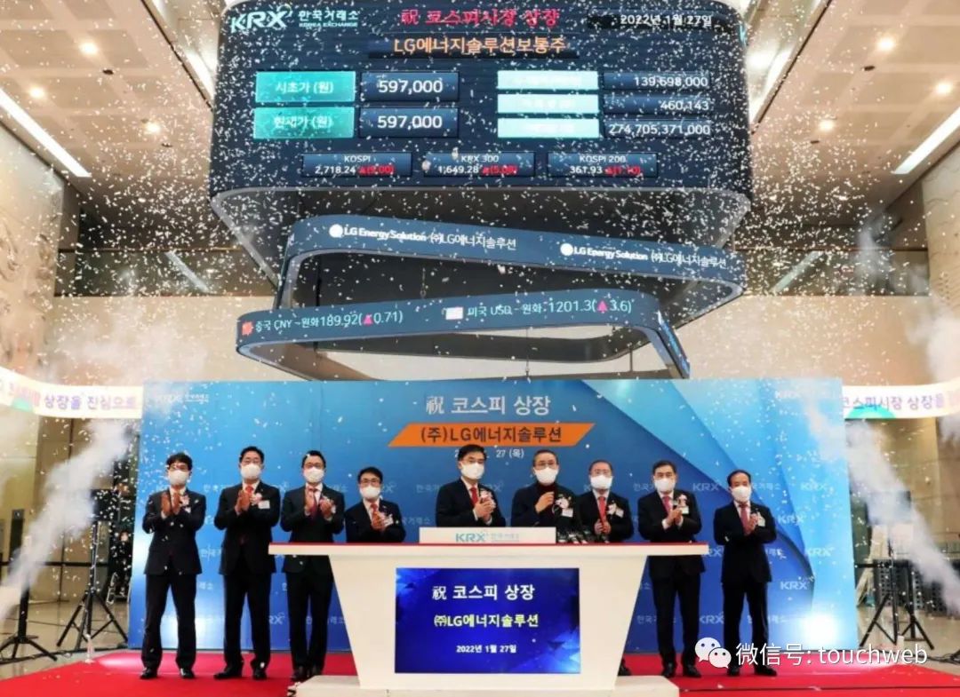 LG新能源上市开盘后股价一度上涨99%,市值超千亿美元。在韩国上市公司市值排行榜上,LG新能源仅次于三星电子。