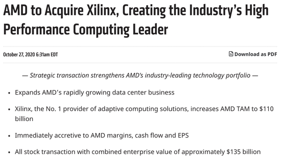 此前350亿美元的全股票交易也随着AMD市值的一路飙升达到了490亿美元。