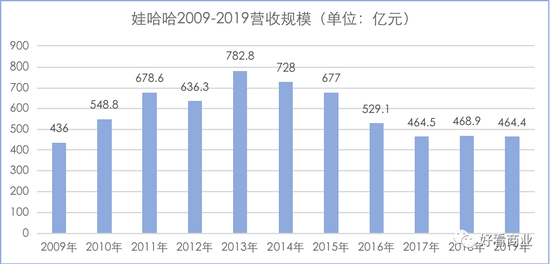 但在2013年营收达到782.8亿元的历史顶点后,娃哈哈的辉煌时代就结束了,开始头也不回地走上了下坡路。