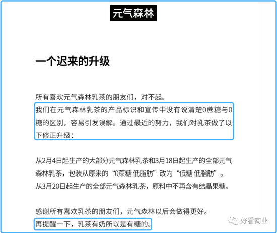 对此,元气森林发布致歉声明“一个迟来的升级”,称其在乳茶产品的标示和宣传中,没有说明“0糖”和“0蔗糖”的区别,容易引发误解。
