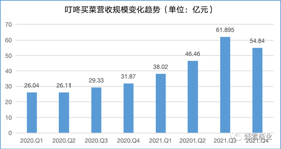 该季度,叮咚买菜GMV达到60.04亿元,同比增长59.6%;实现营收54.8亿元,同比增长72.0%。整个2021年,公司营收201.2亿元,同比大增77.5%。