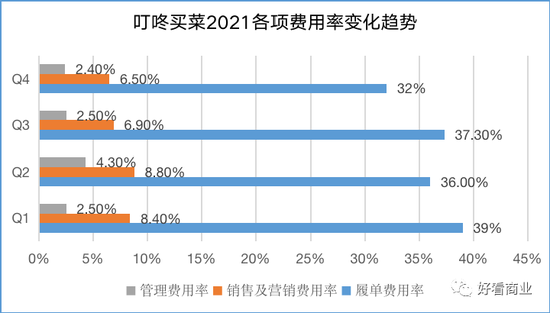 第四季度,叮咚买菜的履单费用率为32%,创历史最低水平。2019和2020年,叮咚的履单费用率分别达49.9%和35.7%。