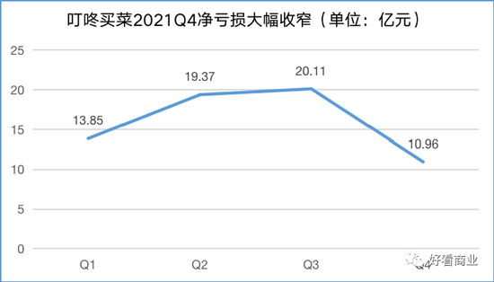 随着毛利率提升,成本下降,公司的亏损额在大幅收窄。第四季度,叮咚买菜净亏损10.96亿元,同比收窄12%;环比Q3收窄45.5%。