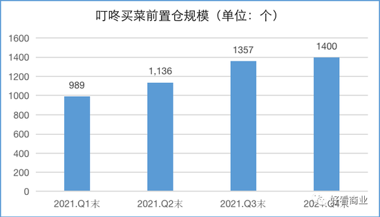 叮咚的“做重”,其中之一就是布局前置仓。截至目前,叮咚买菜共有约1400个前置仓,面积约50万平方米。