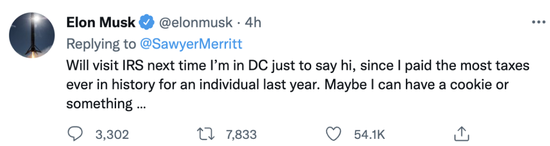 马斯克不高兴了,‘我下次去华盛顿的时候会去美国国税局打个招呼,因为我去年缴纳了史上最多的个人税。也许,我可以吃块饼干什么的……’