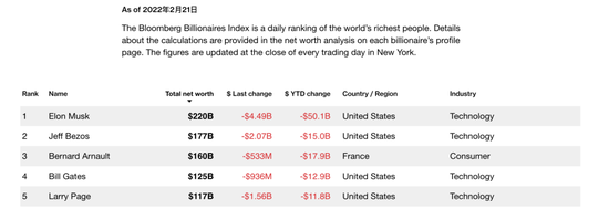 最新的彭博亿万富翁指数显示,世界首富马斯克以2200亿美元净资产排名第一,超过第二名杰夫·贝佐斯的1770亿美元。