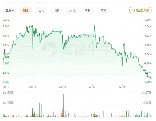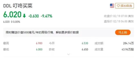 截至2月18日美股收盘,叮咚买菜当日股价大跌9.47%,报6.02美元/股,较上市首日创出的46美元高点已跌近87%。目前,叮咚买菜市值14.16亿美元,相较发行之初的55亿美元,已下跌七成。