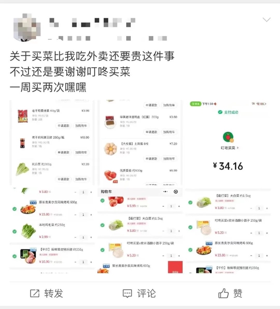 而在客单价方面,最近,不少消费者反映叮咚买菜产品价格有所上涨,一些水果、蔬菜、生鲜产品叮咚上的价格较高。