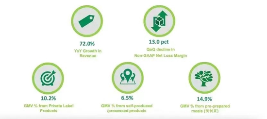 在财报中可以看到,Q4叮咚预制菜销售额占整个GMV的14.9%,自有品牌商品销售占整体GMV的10.2%,整体占比还较低。