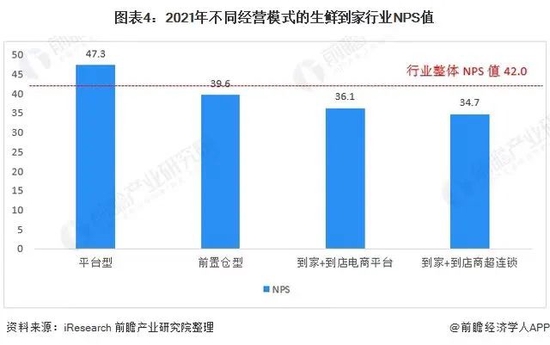 因此,叮咚买菜的对手绝不仅仅是前置仓系其他玩家,而是生鲜到家赛道中的众多选手。据前瞻产业研究院数据显示,2021年生鲜到家用户体验NPS(净推荐值)排行分别为:平台型到家>前置仓型到家>“到家+到店”电商平台>“到家+到店”商超连锁,其中除了平台型,其余三种模式的NPS值均低于行业平均值,可见,叮咚买菜等前置仓系在赢得用户“芳心”上还有一段路要走。