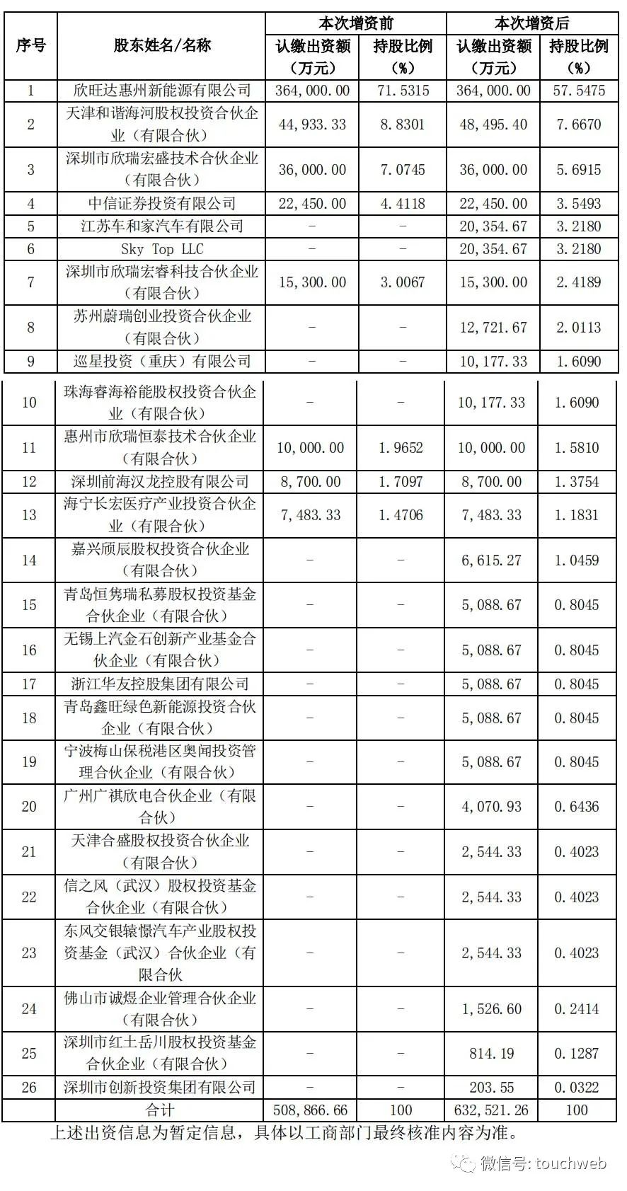 增资前,欣旺达下属子公司欣旺达惠州新能源有限公司持股为71.5315%,天津和谐海河股权投资合伙企业(有限合伙)持股为8.8301%,深圳市欣瑞宏盛技术合伙企业(有限合伙)持股为7.07%,中信证券投资有限公司持股为4.4118%,深圳市欣瑞宏睿科技合伙企业(有限合伙)持股为3%。