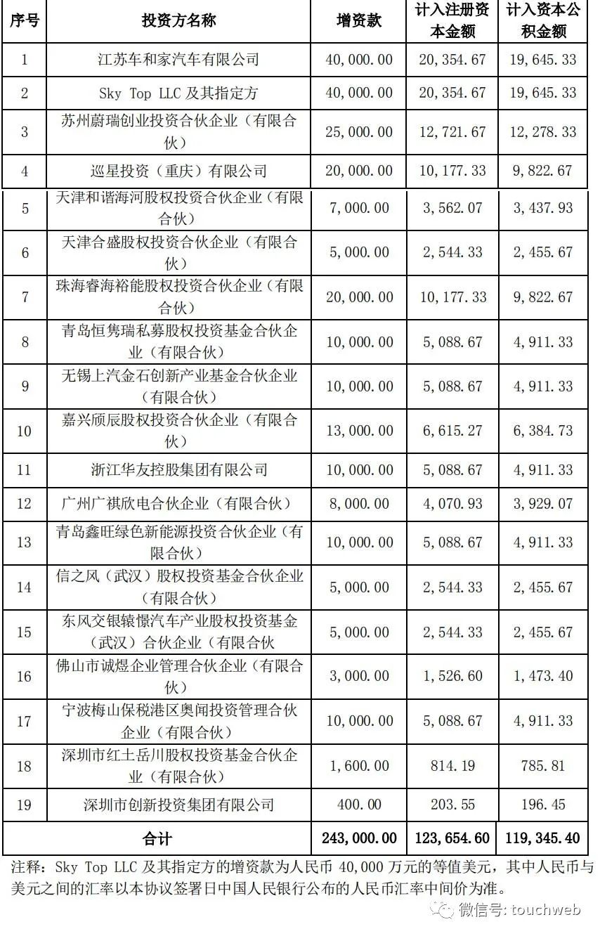 参与方包括天津和谐海河股权投资合伙企业(有限合伙)(简称“和谐海河”)、江苏车和家汽车有限公司(简称“车和家”,理想汽车)、Sky Top LLC(简称“Sky Top”)、苏州蔚瑞创业投资合伙企业(有限合伙)(简称“蔚瑞投资”)、巡星投资(重庆)有限公司(简称“巡星投资”)、珠海睿海裕能股权投资合伙企业(有限合伙)(简称“睿海裕能”)、嘉兴颀辰股权投资合伙企业(有限合伙)(简称“嘉兴颀辰”)、青岛恒隽瑞私募股权投资基金合伙企业(有限合伙)(简称“恒隽瑞”)、无锡上汽金石创新产业基金合伙企业(有限合伙)(简称“上汽金石”)、浙江华友控股集团有限公司(简称“华友控股”)、宁波梅山保税港区奥闻投资管理合伙企业(有限合伙)(简称“奥闻投资”)、广州广祺欣电合伙企业(有限合伙)(简称“广祺欣电”)、天津合盛股权投资合伙企业(有限合伙)(简称“合盛投资”)、青岛鑫旺绿色新能源投资合伙企业(有限合伙)(简称“鑫旺绿色”)、信之风(武汉)股权投资基金合伙企业(有限合伙)(简称“信之风投资”)、东风交银辕憬汽车产业股权投资基金(武汉)合伙企业(有限合伙)(简称“交银辕憬”)、佛山市诚煜企业管理合伙企业(有限合伙)(简称“佛山诚煜”)、深圳市红土岳川股权投资基金合伙企业(有限合伙)(简称“红土岳川”)、深圳市创新投资集团有限公司(简称“深创投”)共19 家企业。