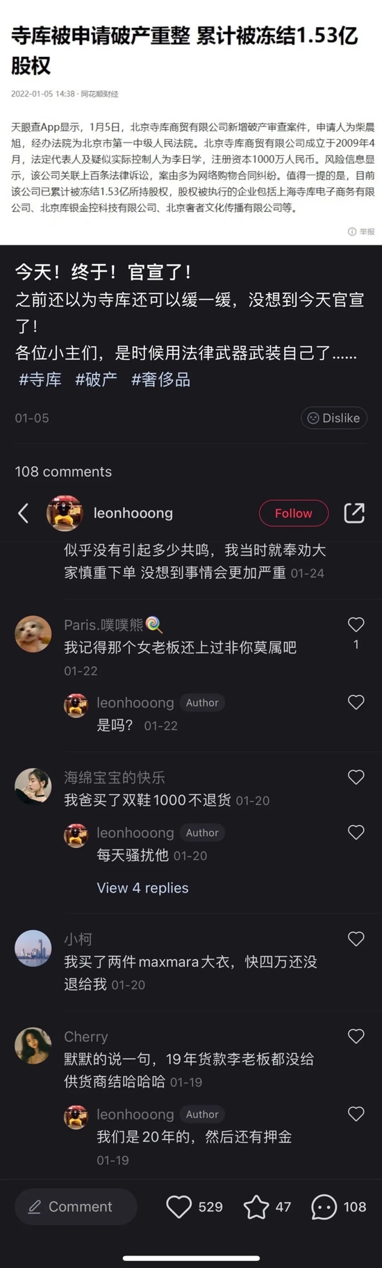 其中,从线下二手奢侈品门店起家的寺库杀出重围,成为“奢侈品电商第一股”,一度风光无限。如今股价却长期低于1美元,破产之说还甚嚣尘上,小红书上“如何在寺库退款”的维权笔记成了目前该公司的最强品宣。