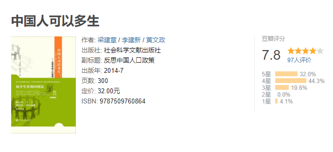 从2012年到2020年,他先后出版了四本书:《中国人可以多生吗?》《中国人可以多生!》《人口创新力》《永生之后》。除了最后一本是科幻小说,前三部都是学术性著作,它们在豆瓣的评分,正在逐渐拉高,目前分别是7.5、7.8、8.0分。