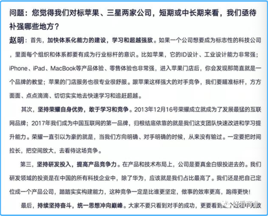 在网传的一份内部会议纪要中,荣耀的CEO赵明毫不吝啬对苹果的赞美。