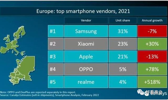 2021年,伴随华为手机在欧洲急剧下滑后,三星、苹果、小米、OV等本土厂商,都在欧洲市场拼命抢市场。