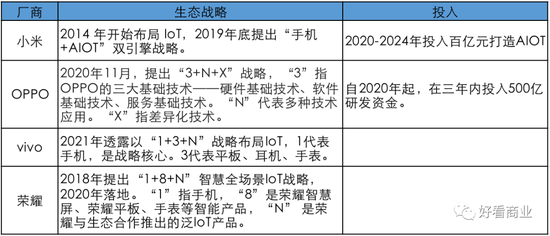 现在,小米有“手机+AIOT”战略;OPPO 有“3+N+X”科技跃迁战略;vivo要借助“1+3+N”战略布局IOT;荣耀也在推“1+8+N”全场景IoT战略。