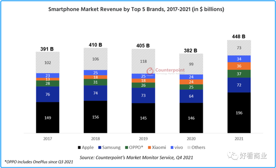TOP5中的三星、OPPO、小米、vivo四家的手机收入加起来还不及苹果一家。