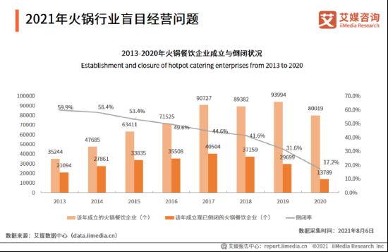 过去几年,火锅品牌雨后春笋般涌现,但裁汰率也高得可怕。据艾媒咨询数据,2016年和2019年成立的火锅餐饮企业倒闭率分别约为50%和30%,有半数左右的火锅餐饮企业活不过5年,约3成的火锅餐饮企业在两年内倒闭。