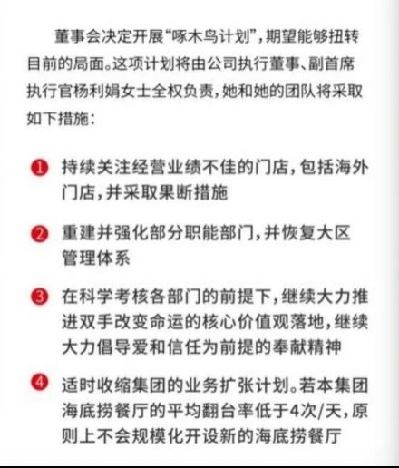 海底捞断腕自救策略之一就是,宣布在翻台率没有回升到4次/天前原则上不再扩张。