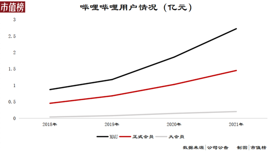 月活跃用户数量(MAU)。年报显示,MAU为2.72亿,根据新闻报道,2022年第一季度,哔哩哔哩的MAU已达到3亿。按照目标,到2024年应该达到4亿。