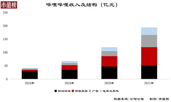 移动游戏。哔哩哔哩为第三方游戏开发商发行移动游戏,游戏中出售的虚拟道具是收入主要来源。原本移动游戏是最重要的收入构成,后来为了多条腿走路,游戏占比越来越低;