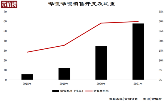 2020年,哔哩哔哩用于销售和营销的开支,陡然增加。2021年,销售费用为57.95亿元,同比增长65.94%。销售开支占收入的比重也是从2020年开始上升,从2018年和2019年的14.2%和17.7%,上升到2020年和2021年的接近30%。