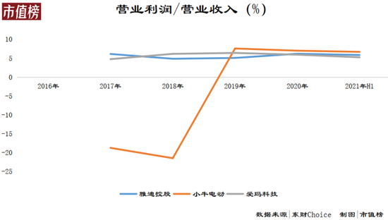 尽管小牛电动有10个点的毛利率优势,营业利润率(即不考虑财务费用、所得税等和经营能力联系不紧密的因素)却和爱玛科技、雅迪在同一水平,5%—7%。