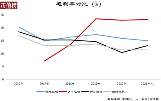 横向比较,2019年开始,小牛电动的毛利率就高于新日、爱玛和行业老大雅迪。2021年上半年,小牛电动比雅迪和新日均高出近10个百分点,比爱玛科技高出近12个百分点。